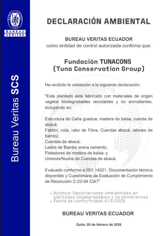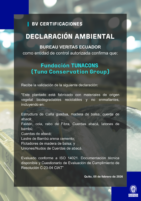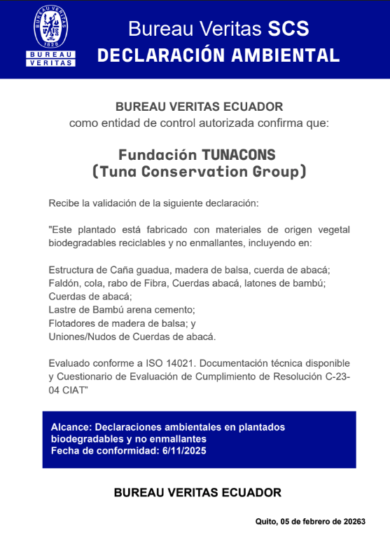 This validation was granted by Bureau Veritas Ecuador through an Environmental Declaration, following a technical evaluation process conducted in accordance with ISO 14021 and the Compliance Assessment Questionnaire of IATTC Resolution C-23-04. The assessment included a detailed review of technical documentation and verification of the materials used in the construction of the FADs.