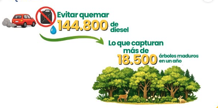 El impacto climático es tangible: esta reducción equivale a evitar el consumo de aproximadamente 144.800 galones de diésel o al efecto positivo que generan más de 18.500 árboles maduros en un año.
